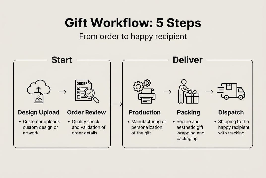 A personalised gift workflow is the step-by-step process for taking a custom gift order from design submission through production to delivery. Personalised orders move through design previews, production queues, and tracking stages within a structured system.